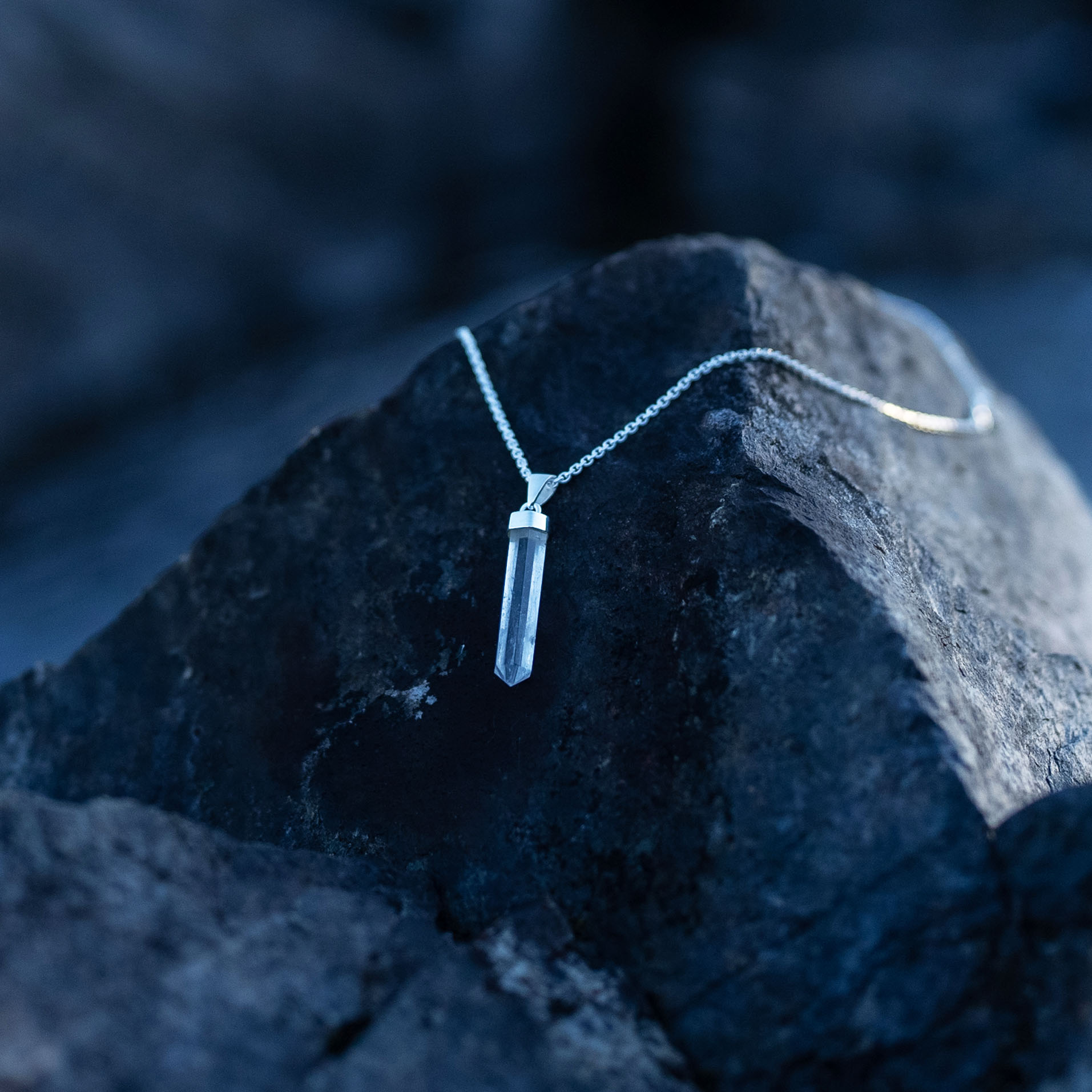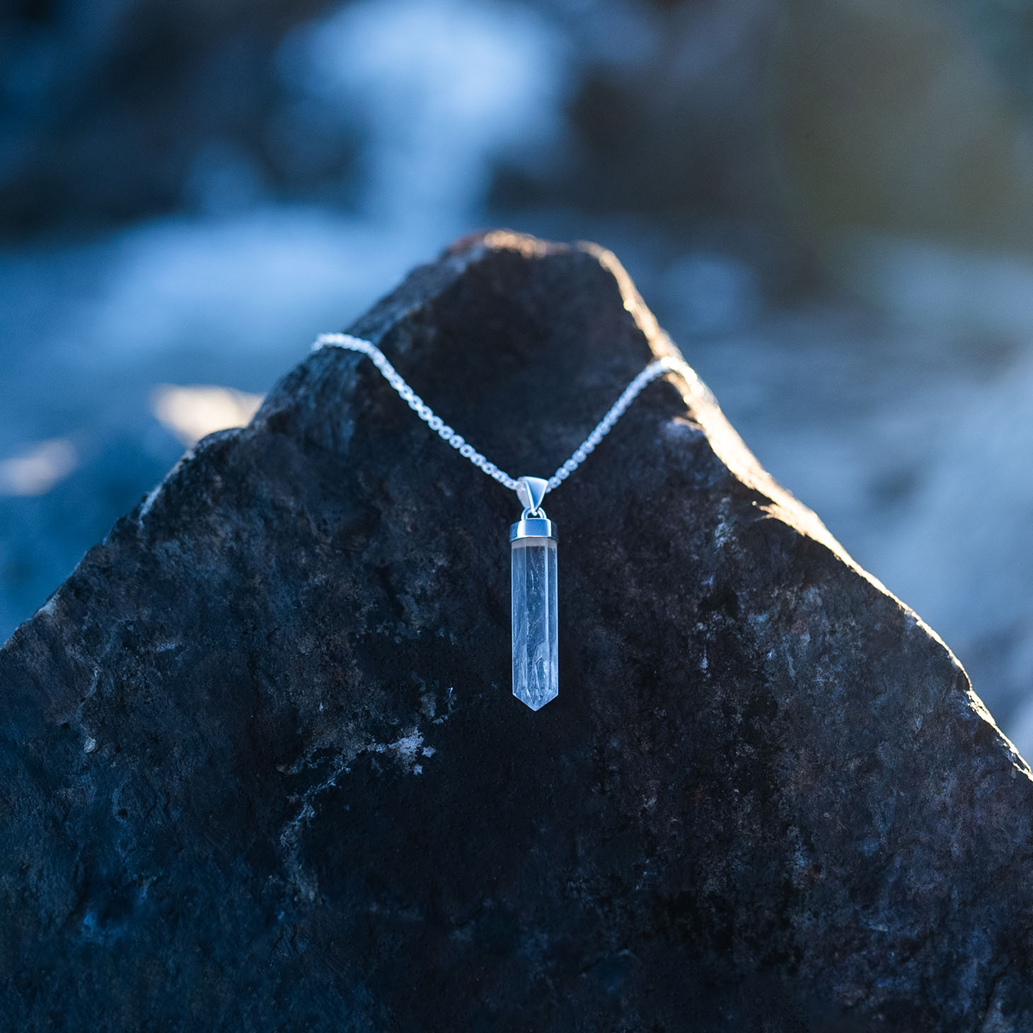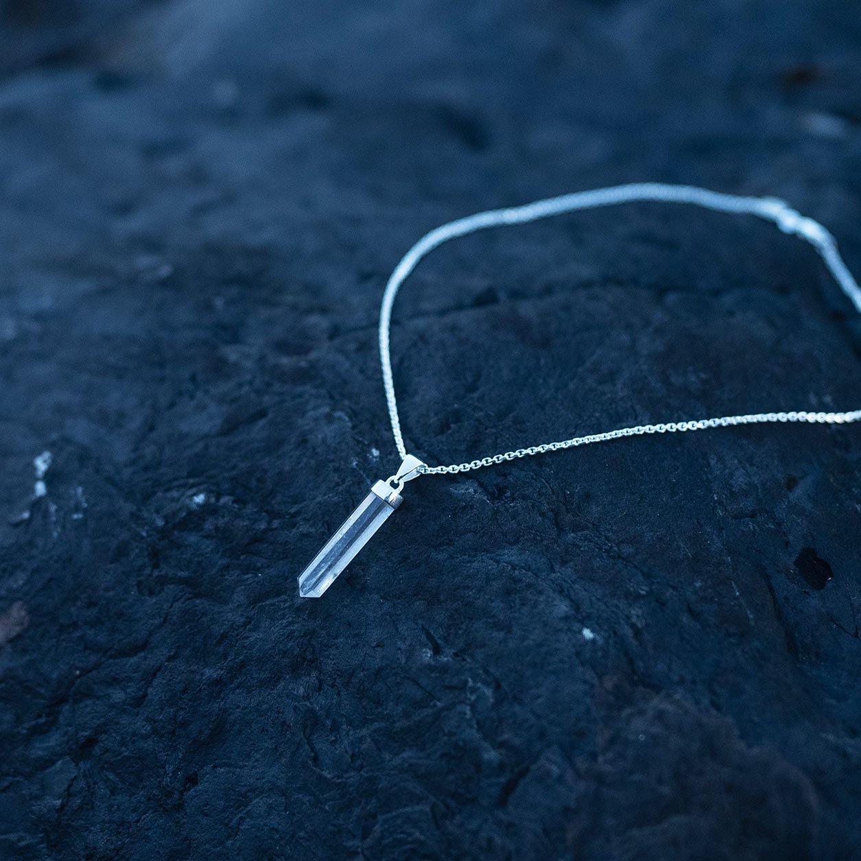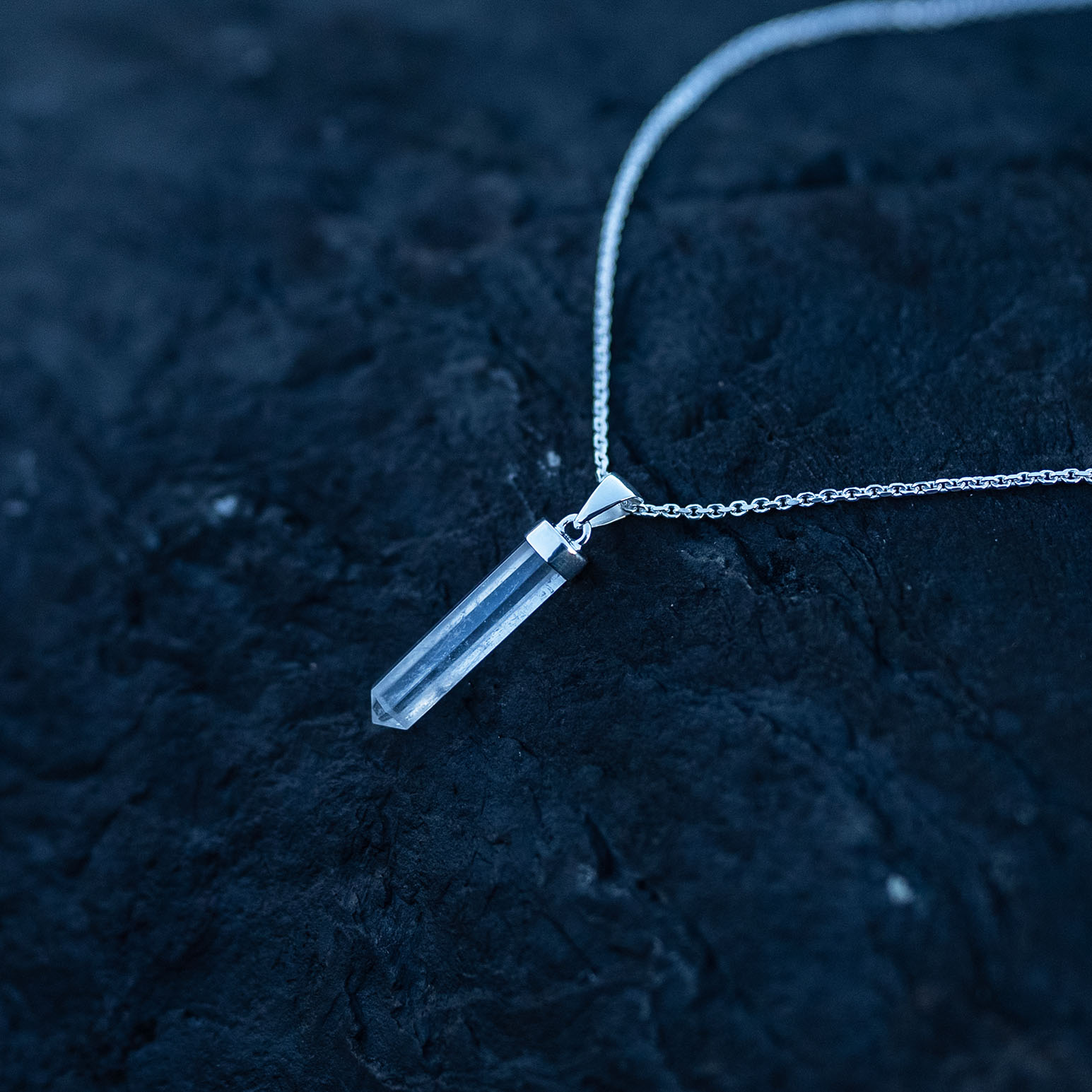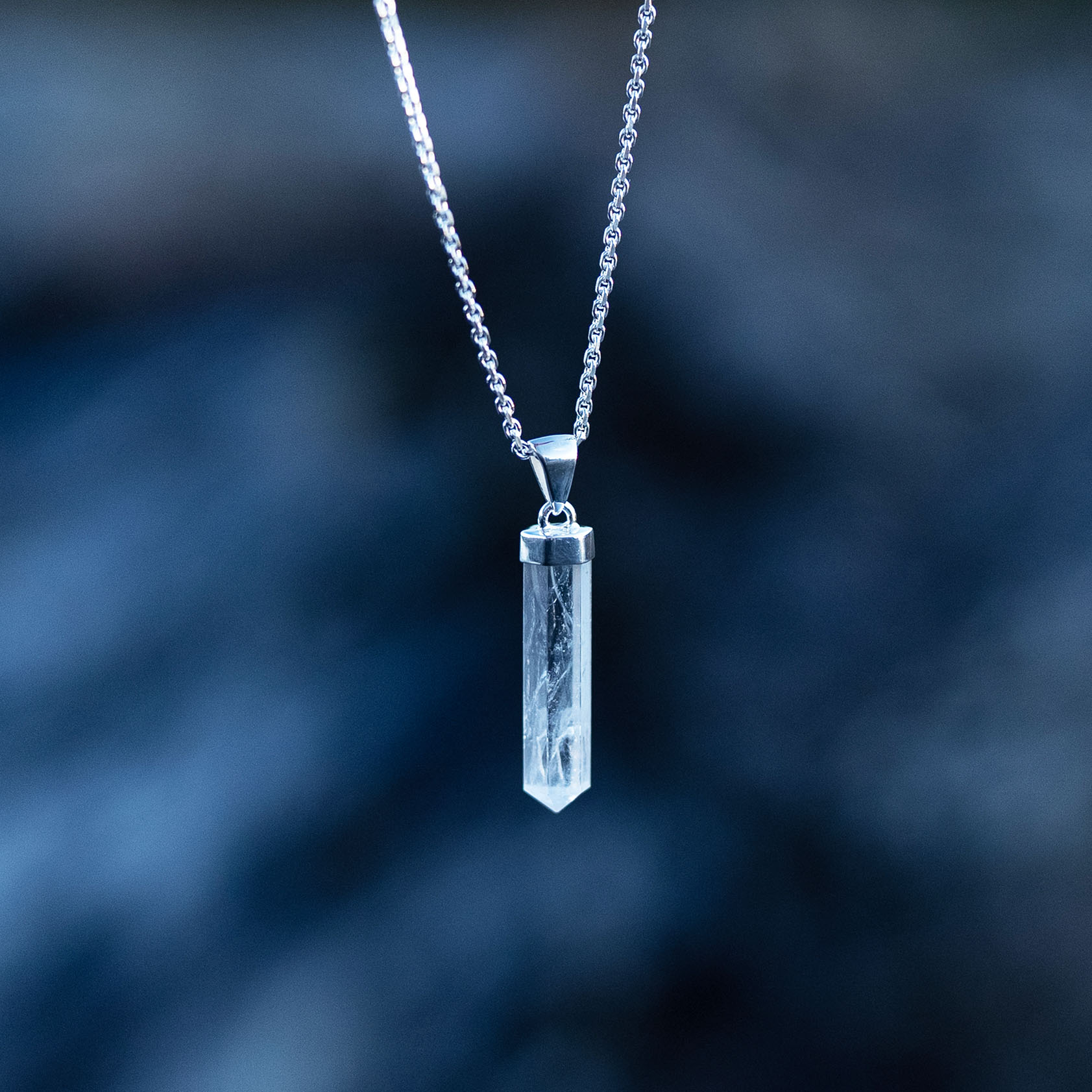 A necklace with a clear crackled Quartz crystal rod, on a faceted silver chain.
