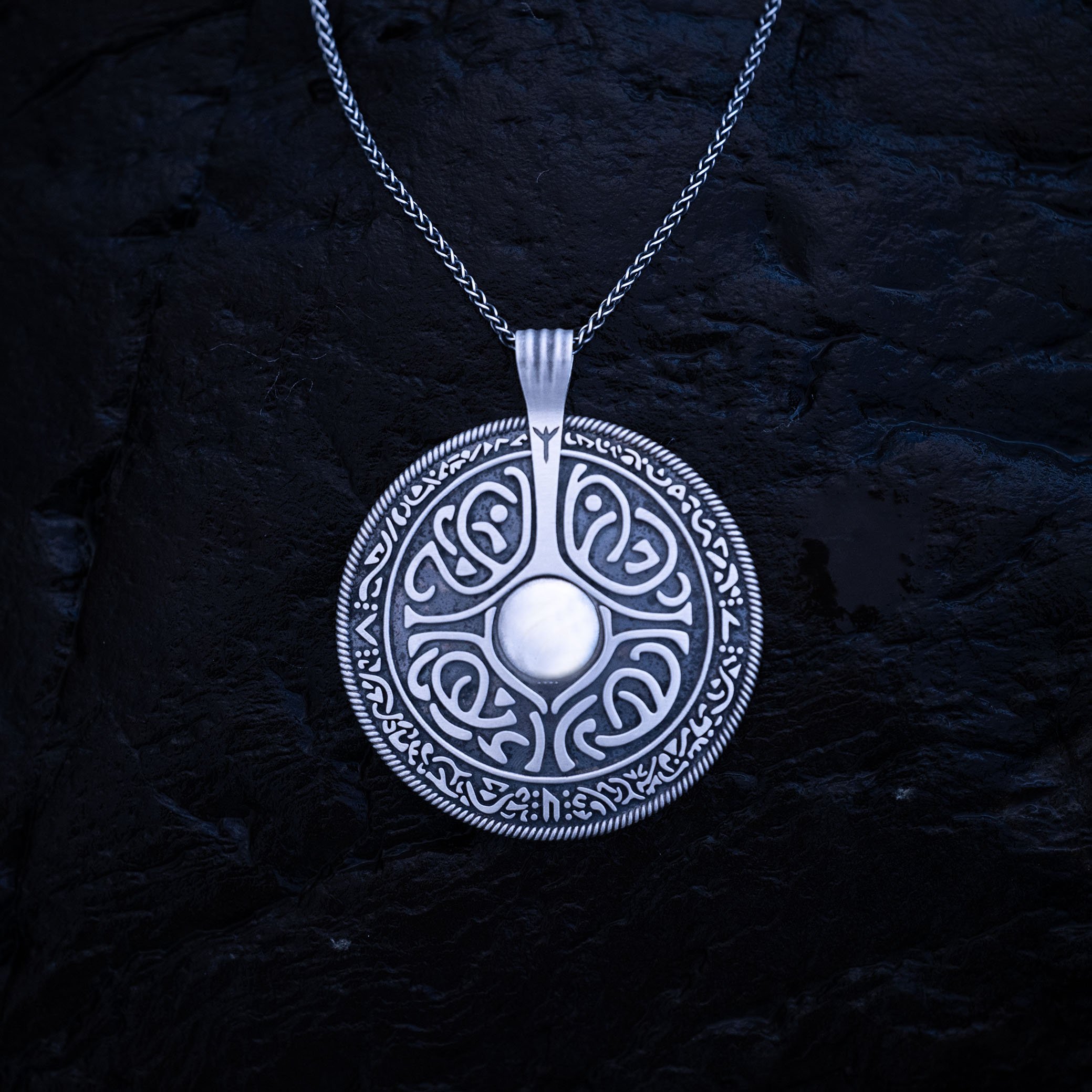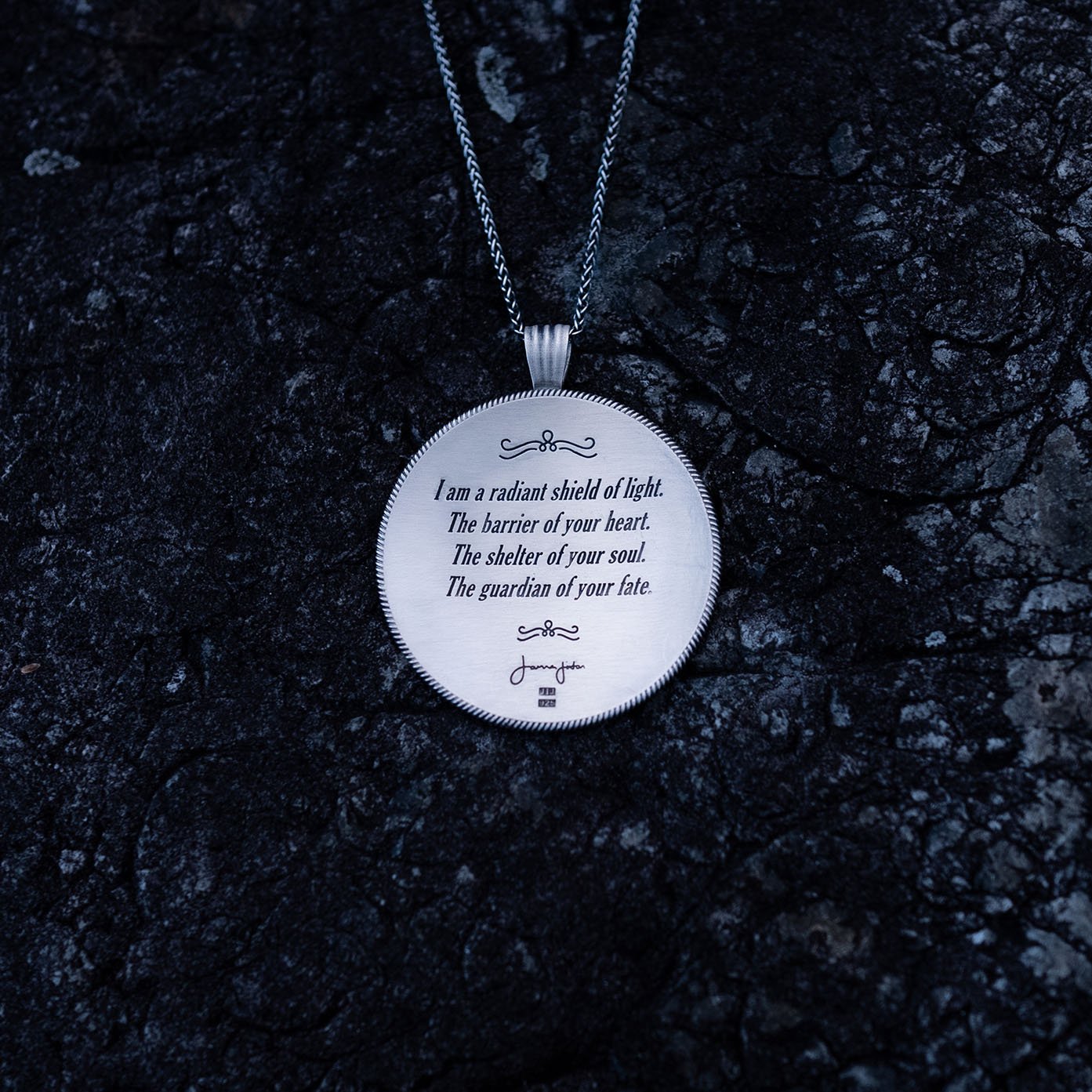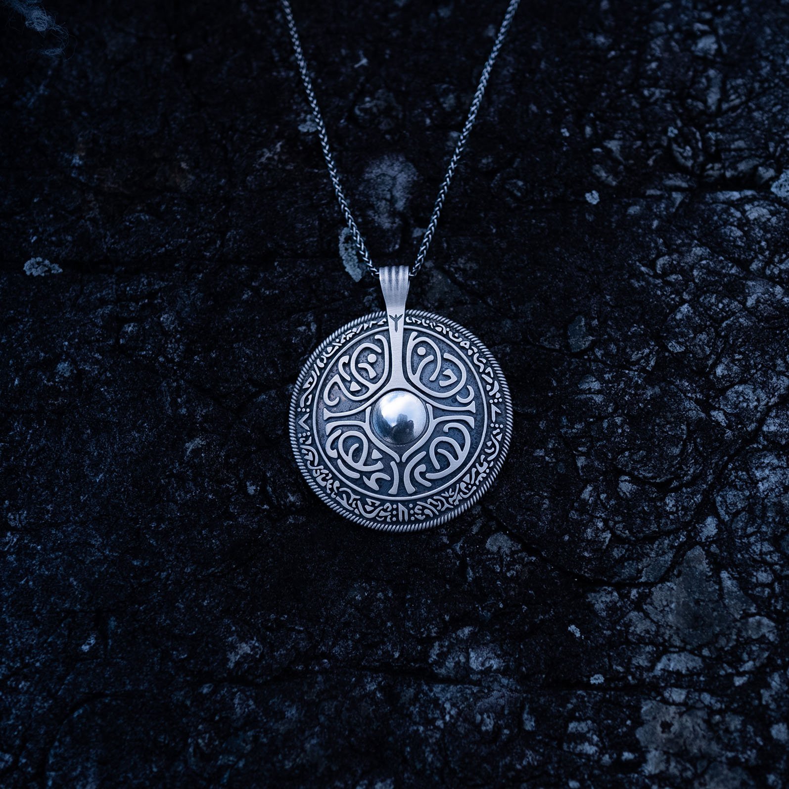A bold and powerful pendant crafted in solid sterling silver, designed as a protective shield with four ancient runes engraved in its form.