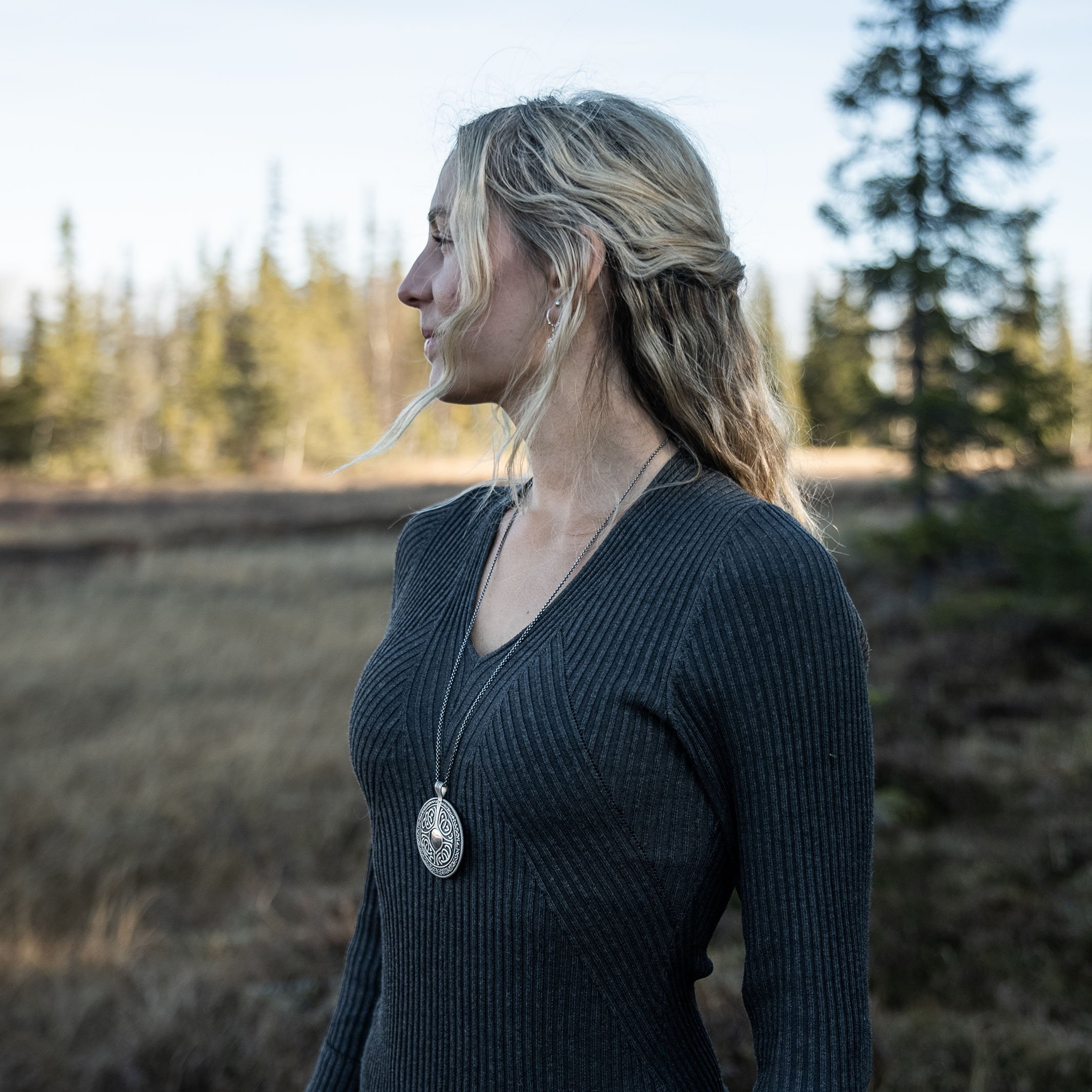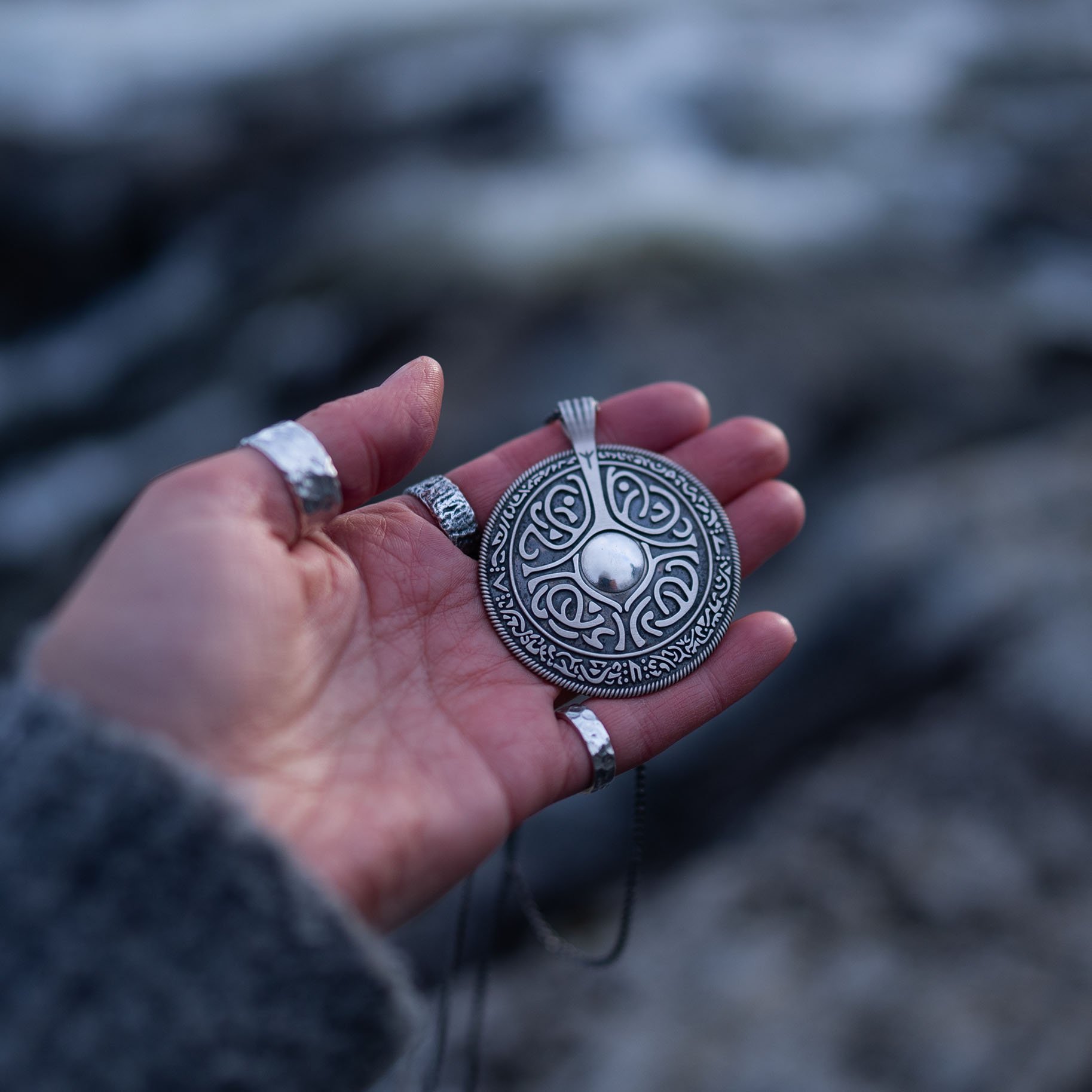 a Nordic silver shield, shaped as a heart-armour of protection and presence.