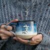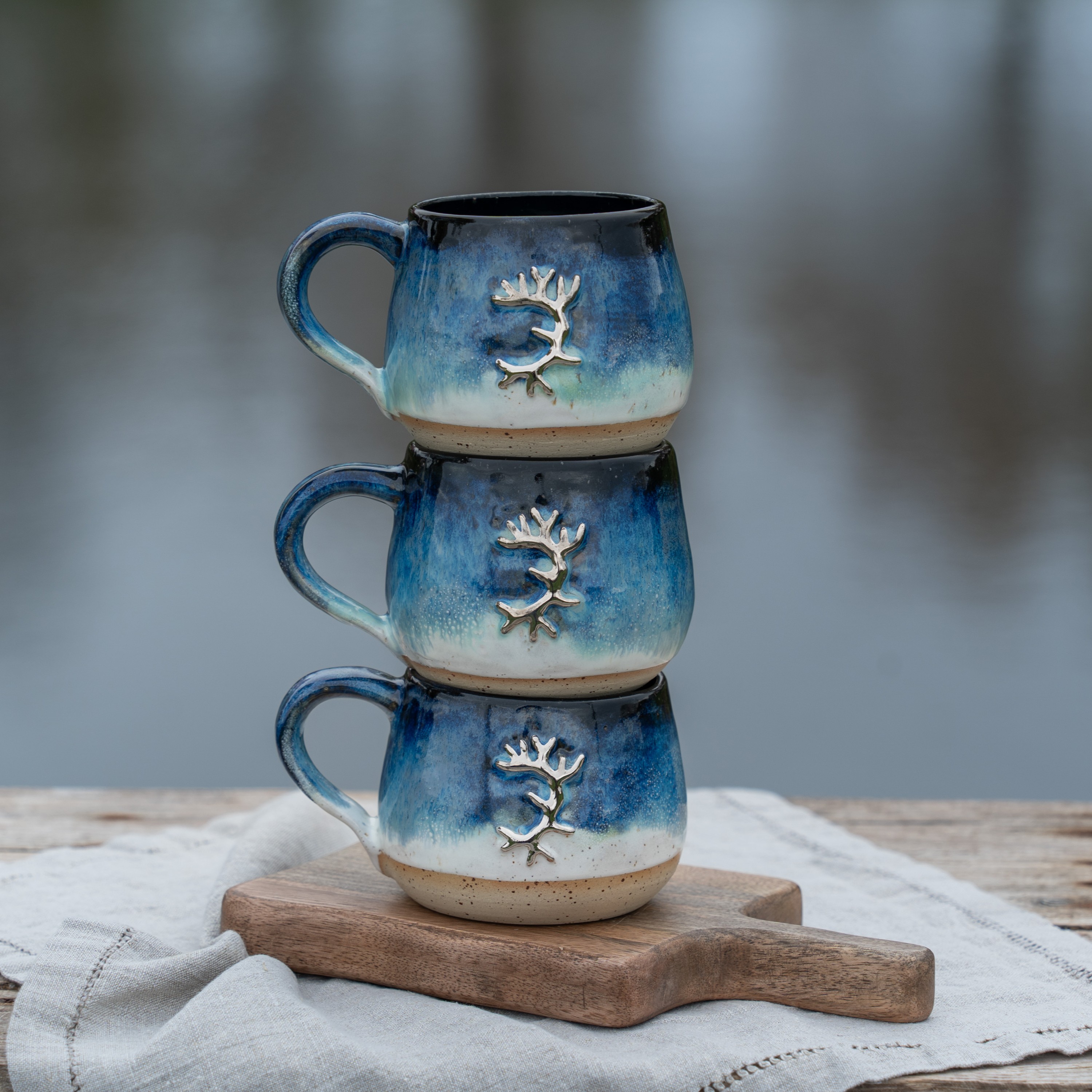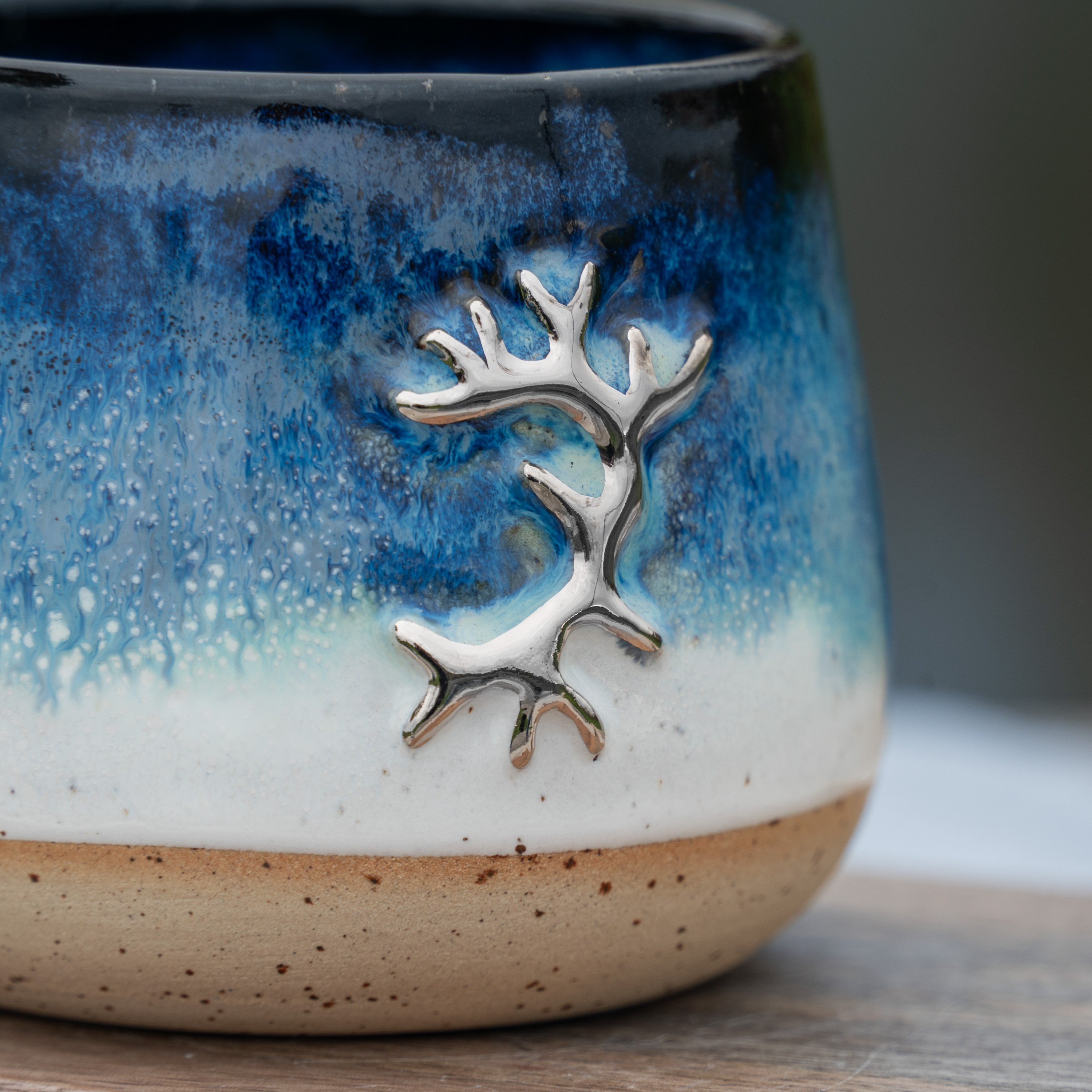 A mug inspired by the raw beauty of the north, where blue skies meet deep waters, and snowflakes dance beneath the northern lights.The silvery antler, made of real platinum silver, is directly shaped from our Wild jewelry collection. A symbol of strength and freedom.